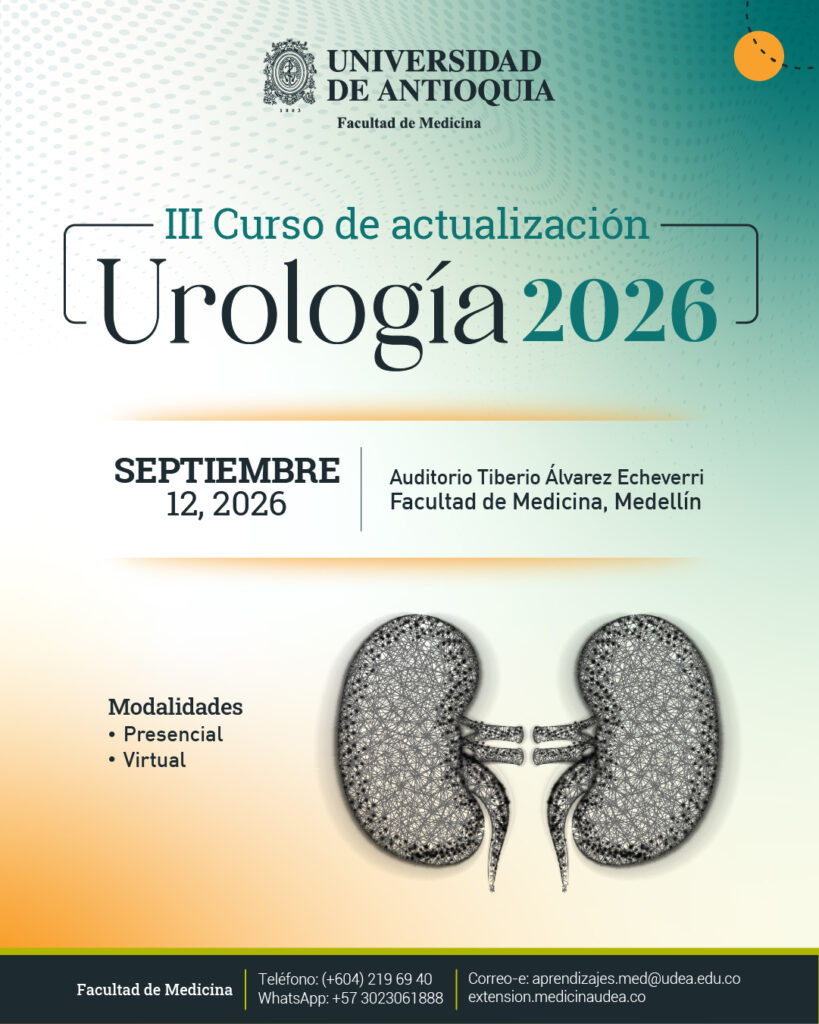 El Curso de Actualización en Urología 2026 es un espacio académico diseñado para reforzar los conocimientos esenciales en el abordaje de patologías urológicas en urgencias y consulta externa. Liderado por los residentes del programa de Urología de la Universidad de Antioquia, este curso ofrece una actualización práctica y basada en evidencia para médicos generales, residentes y profesionales de la salud interesados en fortalecer su capacidad diagnóstica y terapéutica en el área. Una oportunidad ideal para mejorar el enfoque clínico y tomar decisiones con mayor seguridad y precisión.
