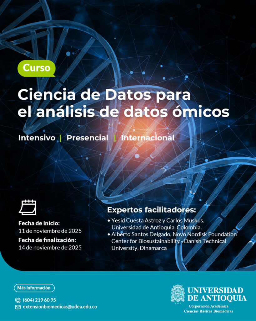 Este curso intensivo de 32 horas ofrece una formación práctica y actualizada en ciencia de datos aplicada al análisis de datos ómicos, como metagenómica, transcriptómica y proteómica. El objetivo principal es capacitar a investigadores, bioinformáticos y profesionales del área de las ciencias biológicas y de la salud en el manejo de herramientas y metodologías de análisis de datos omicos para extraer información significativa. A través de clases interactivas, ejercicios prácticos y el uso de datos reales, los participantes desarrollarán habilidades para explorar, visualizar e interpretar datos ómicos, además de aplicar modelos de redes biológicas para resolver preguntas sobre los datos utilizados.