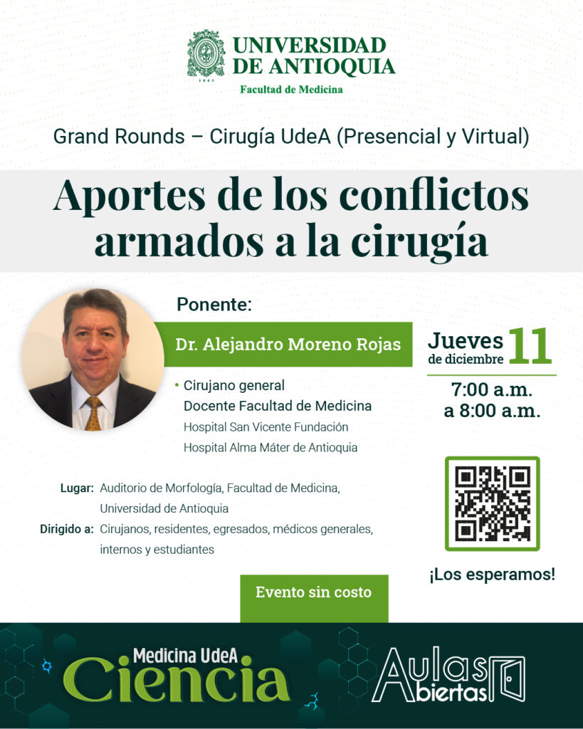 Grand Rounds Encuentros académicos periódicos del Departamento de Cirugía para el análisis de casos, discusión de temas actuales y actualización clínica con expertos nacionales e internacionales. + Añadir Google Calendar + exportación iCal / Outlook Tags:Academia, Actualización, Casos Clínicos, Cirugía, Expertos Fecha Dic 11 2025 Hora 7:00 am - 8:00 am Etiquetas Ingreso libre Lugar Auditorio Jaime Bustamante Betancur (Morfología) Facultad de Medicina Carrera 51D # 62-29 Campus Medellín Categoría En Vivo Encuentros académicos Presencial Organiza Facultad de Medicina Teléfono (604)2196940 Correo electrónico [email protected] Compartir este evento