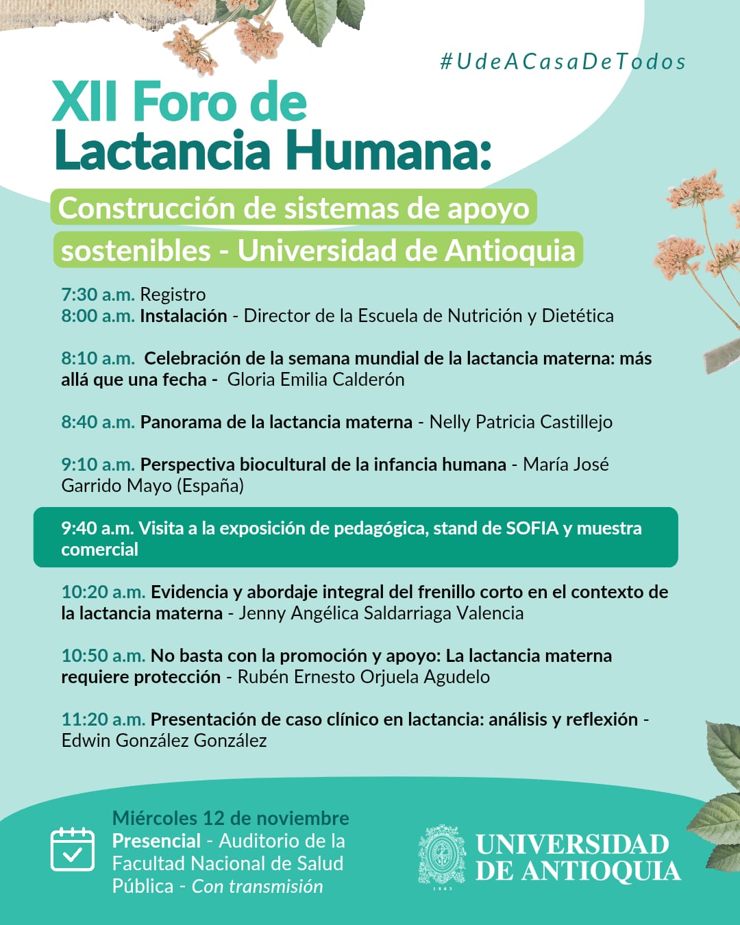 XII Foro de Lactancia Humana ¡No te quedes sin tu lugar! Realiza tu inscripción cuanto antes Inscripciones + Añadir Google Calendar + exportación iCal / Outlook Fecha Nov 12 2025 Finalizado Hora de Colombia 7:30 am - 11:55 am Etiquetas Ingreso libre, previa inscripción Lugar Auditorio Facultad Nacional de Salud Pública Calle 62 # 52-59 Campus Medellín Categoría Foros Presencial Organiza Facultad de Medicina Teléfono (604)2196940 Correo electrónico [email protected] Compartir este evento